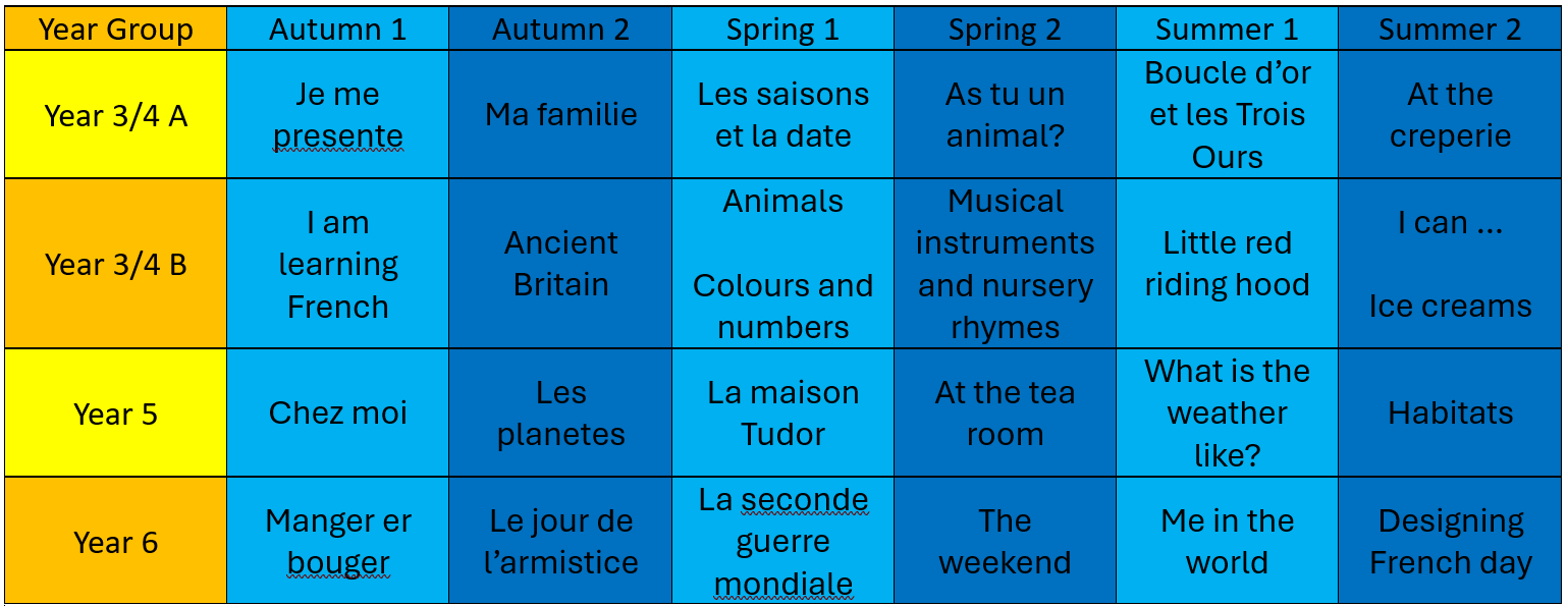 Our learning in French aims to inspire curiosity and wonder that comes with learning a new language. Our units are planned to develop progressive understanding and our delivery has a keen focus on oracy and reading. We use the sessions to broaden horizons and to empower our children to look far and wide when considering the world that is available to them.