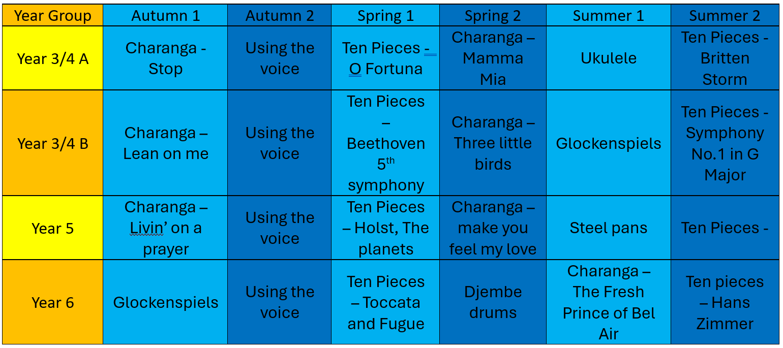 At the centre of our music curriculum, our aspiration is to provide an inspiring, broad and rigorous music education. Our endeavour is to develop ambition within each child as they nurture their own individual passion and love for song/music. Our aim is to enhance their understanding of culture, diversity and history of music as they explore different genres through the years.